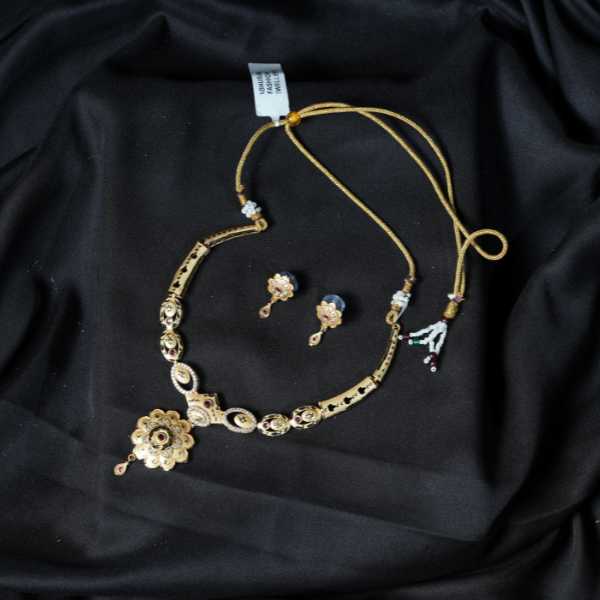 Grace your look with this 1 gram gold plated necklace set, featuring a delicate traditional design with matching earrings. Lightweight, elegant, and perfect for festive, wedding, and party wear across all seasons.