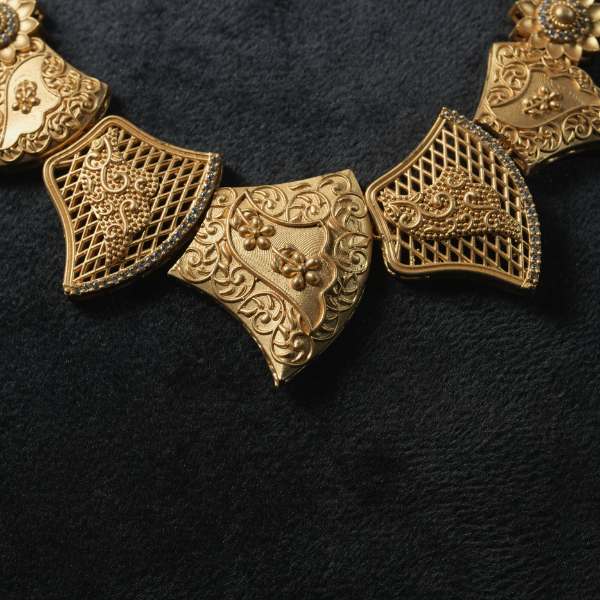 Enhance your ethnic elegance with this beautifully crafted antique design necklace set, inspired by timeless traditional jewellery patterns. The necklace showcases detailed engraved panels with an antique gold finish, creating a rich and heritage-inspired look. The matching earrings mirror the necklace design, completing the set with perfect symmetry and grace.