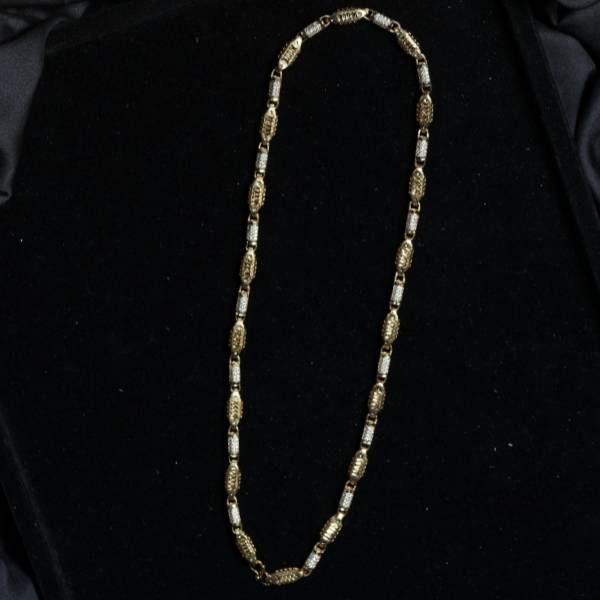 This beautifully designed chain of heritage reflects classic craftsmanship rooted in traditional jewellery aesthetics. The necklace features finely detailed patterned links arranged in a balanced sequence, creating a graceful and culturally inspired look. Each link carries a subtle texture that adds depth, character, and a sense of heritage to the design.