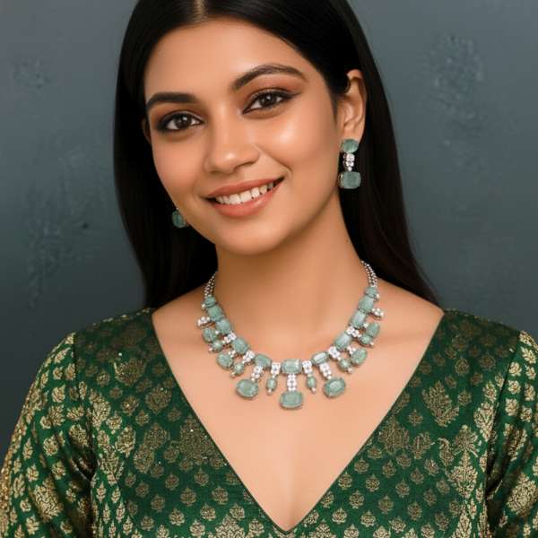 Enhance your jewellery collection with this beautifully crafted cz stone necklace, designed with rich green cubic zirconia stones that offer a luxurious gemstone look. The silver-tone plated base adds durability and shine, while the coordinated earrings complete the statement ensemble. Lightweight yet eye-catching, this necklace set pairs effortlessly with ethnic outfits, sarees, lehengas, and contemporary festive wear. Ideal for weddings, celebrations, parties, and gifting, it delivers elegance without compromising comfort. A timeless design suitable for modern Indian and global fashion preferences.