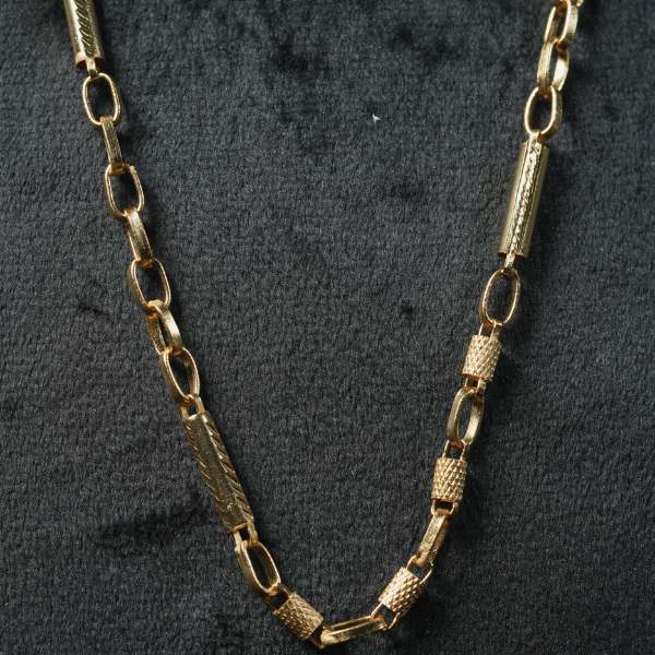 This gold link chain is crafted for women who appreciate simplicity with refined elegance. Featuring evenly spaced polished links and textured gold-tone accents, the chain offers a balanced blend of modern style and timeless appeal. Its lightweight construction ensures all-day comfort, making it ideal for everyday wear, office styling, and casual outings.