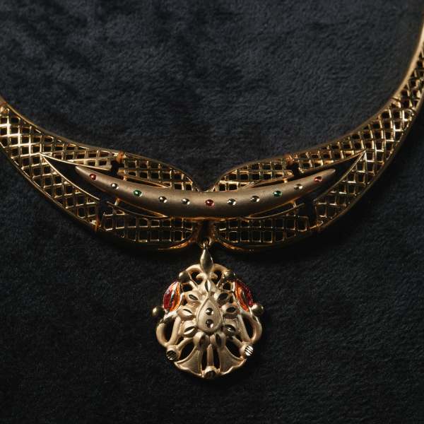 Elegant gold mesh necklace with intricate detailing, perfect for festive and evening wear.