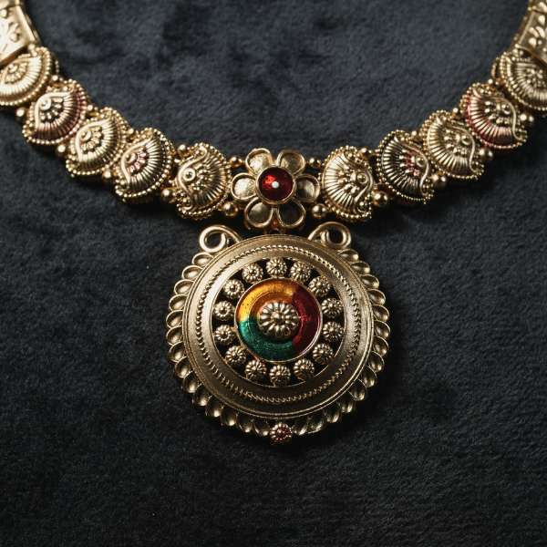 This Kundan Necklace Set reflects the rich heritage of Indian jewellery craftsmanship, featuring finely detailed kundan work combined with an antique gold finish. The necklace is adorned with traditional circular motifs and a striking central pendant, highlighted by deep-toned stones that add royal depth and character.