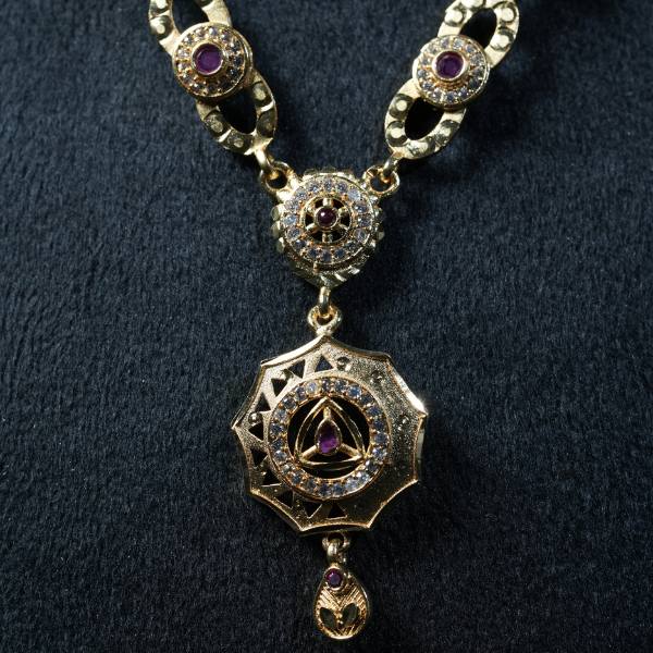 The Lotus Ruby Necklace Set features an intricately crafted lotus motif paired with ruby-colored stones and an antique gold finish. Designed to reflect traditional Indian artistry, this set offers a balanced blend of elegance and cultural symbolism. Lightweight yet visually rich, it sits comfortably on the neckline and complements bridal, festive, and ethnic ensembles. The matching earrings complete the look, making it suitable for weddings, religious functions, and celebratory events. A versatile jewelry set that adds warmth, tradition, and refined beauty to every appearance.