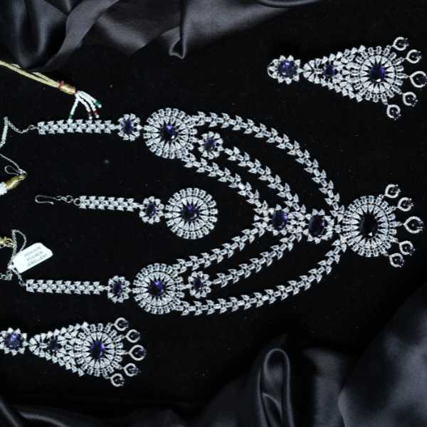Make a lasting impression with this exquisitely designed white crystal necklace set, crafted to add luxury and brilliance to your look. The set showcases radiant white crystals beautifully arranged in an intricate pattern, enhanced with eye-catching blue stone accents that add depth and royal charm.