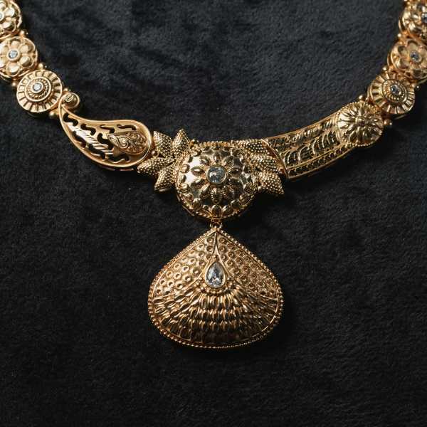This one gram gold necklace set is crafted to deliver a classic gold jewellery look with modern affordability. Featuring intricate detailing and a graceful pendant design, the necklace sits beautifully on the neckline while the matching earrings complete the traditional appeal. The high-quality gold plating offers a rich shine and long-lasting finish, making it ideal for weddings, festive occasions, parties, and cultural celebrations. Lightweight and comfortable for extended wear, this necklace set is perfect for women who want a luxurious appearance without investing in heavy gold jewellery. A versatile addition to any jewellery collection, suitable for daily elegance or special occasions.