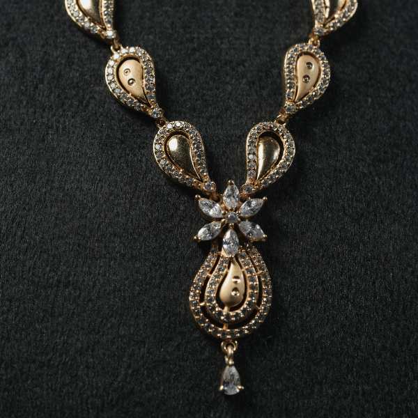The Teardrop Radiance Necklace Set features a timeless arrangement of delicately linked teardrop elements, finished in rich gold plating with refined stone accents. Designed to sit perfectly along the neckline, it creates a balanced blend of elegance and visual depth. The matching earrings mirror the necklace design, completing a coordinated look suitable for festive occasions, weddings, and cultural events. Lightweight yet striking, this set is comfortable for extended wear and complements both traditional and contemporary outfits. A versatile choice for women who value classic design with a modern finish.
