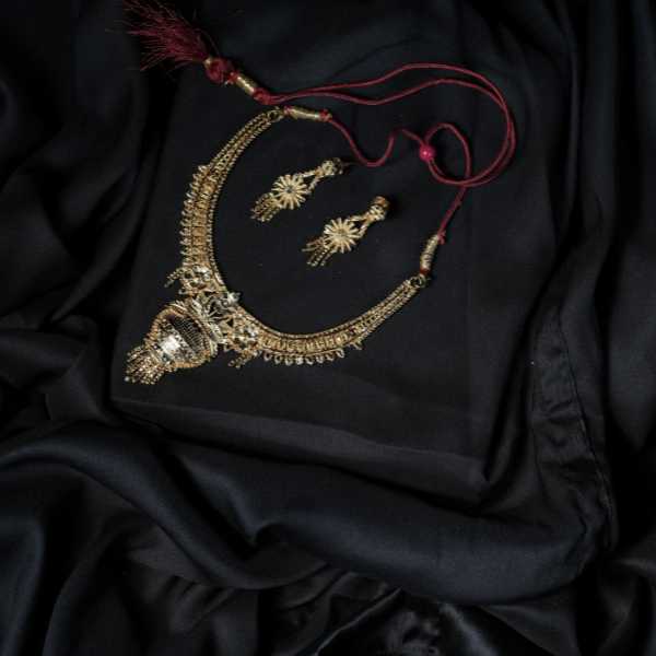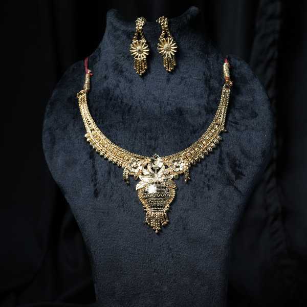 Enhance your ethnic elegance with this beautifully designed 1 gram gold necklace set, inspired by classic traditional craftsmanship. Featuring a richly detailed necklace paired with matching earrings, this set showcases intricate patterns and a luxurious gold finish that closely resembles real gold jewellery.