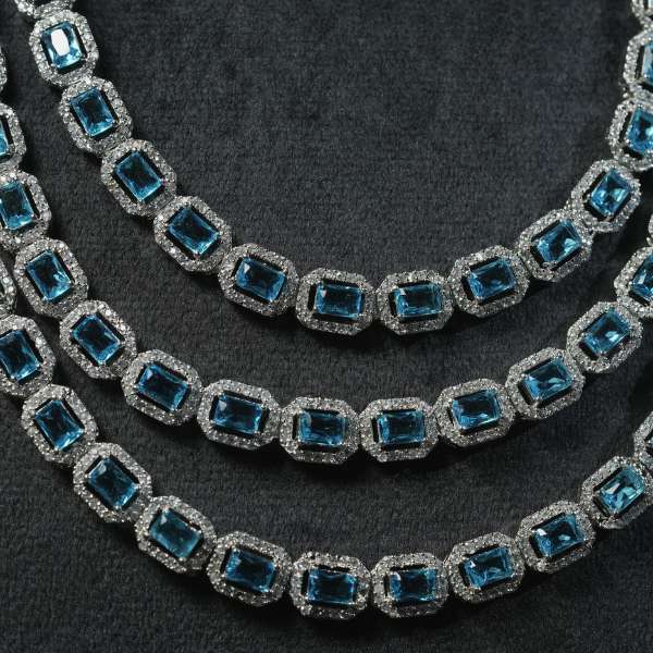 Elevate your festive and bridal looks with this elegant AD choker necklace set featuring sparkling blue stones and a premium silver finish. Designed for weddings, parties, and special occasions.
