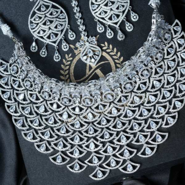 This bridal choker necklace set showcases an ornate layered design crafted with a high-quality silver finish and sparkling crystal accents. The bold choker sits gracefully on the neckline, while the matching statement earrings complete a luxurious bridal look. Designed to complement bridal lehengas, sarees, and gowns, this set offers timeless elegance with modern craftsmanship. Lightweight yet impactful, it ensures comfort during long celebrations. A perfect choice for brides, wedding guests, and festive styling, this jewellery set delivers refined shine, durability, and versatile wear for special occasions.
