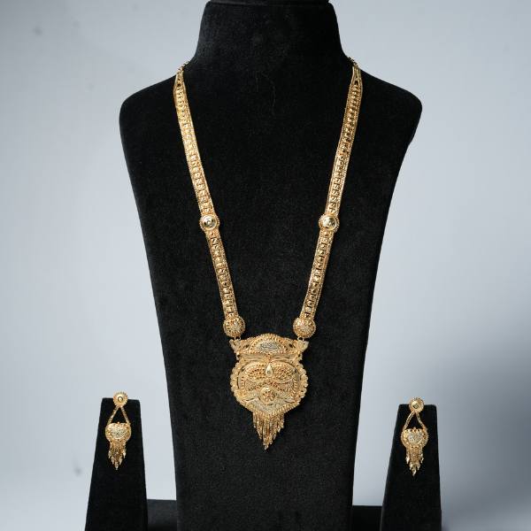 Elegant bridal necklace and haram set gold featuring a long traditional design with matching earrings, perfect for weddings and grand celebrations.