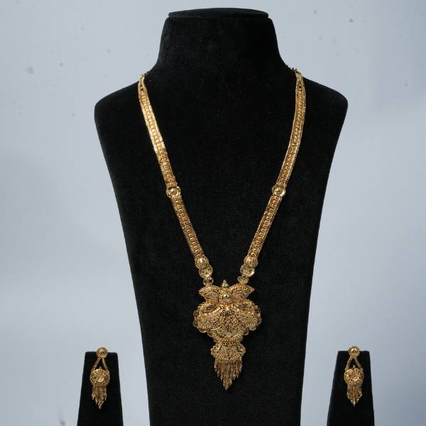 Elegant bridal gold necklace set with a long traditional design and matching earrings, perfect for weddings, receptions, and grand celebrations.