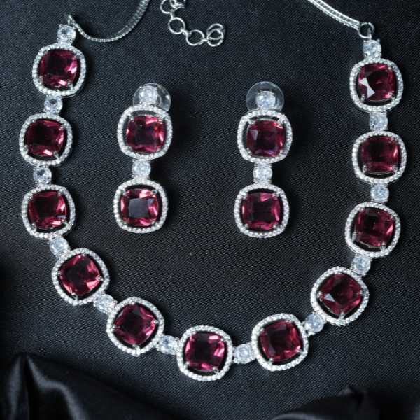 This Cushion-Cut Necklace Set features rich ruby-coloured stones set in a refined silver-plated frame, creating a balanced blend of glamour and sophistication. The cushion-cut design enhances brilliance while maintaining a classic, premium look. Carefully matched earrings complete the set, making it ideal for weddings, receptions, festivals, and formal occasions. Lightweight yet visually striking, it offers all-day comfort without compromising style. Perfect for women seeking elegant jewellery that complements both traditional and modern outfits, this set delivers lasting appeal and confident charm across global fashion tastes.