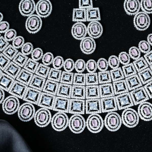 Enhance your ethnic and festive style with this beautifully crafted silver plated jewellery set, designed to offer a refined blend of tradition and modern elegance. The necklace showcases a structured pattern of square and circular stones, finished with premium silver plating that delivers a radiant, long-lasting shine. Matching earrings and a coordinating maang tikka complete the set, creating a harmonious and regal appearance.