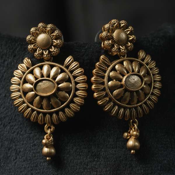 This floral gold necklace is a graceful expression of traditional artistry and feminine elegance. Designed with beautifully sculpted floral motifs, the necklace showcases detailed craftsmanship enhanced by a rich antique gold finish. The central floral pendant adds depth and heritage appeal, while the matching earrings complete the look with perfect balance.