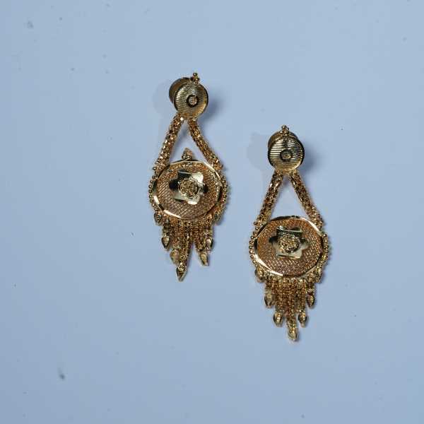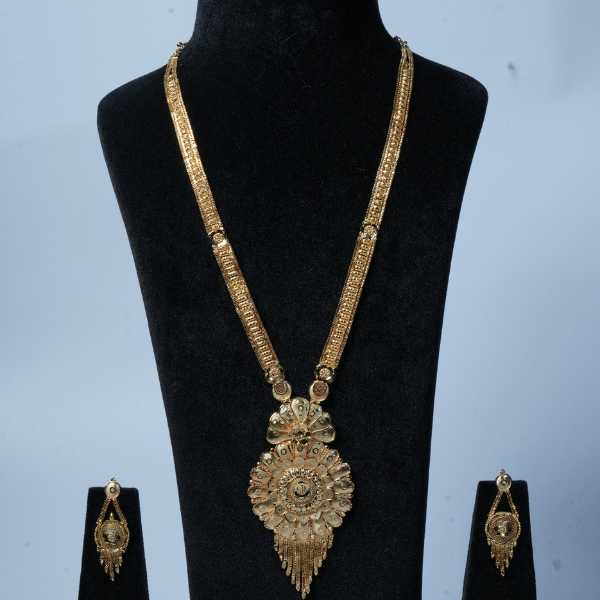 This elegant flower gold necklace set is inspired by classic floral motifs and traditional craftsmanship. The necklace showcases a finely detailed flower-shaped pendant with intricate patterns, paired with a beautifully designed gold-tone chain and matching earrings that complete the set.