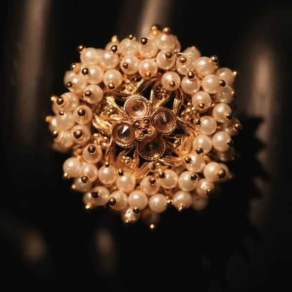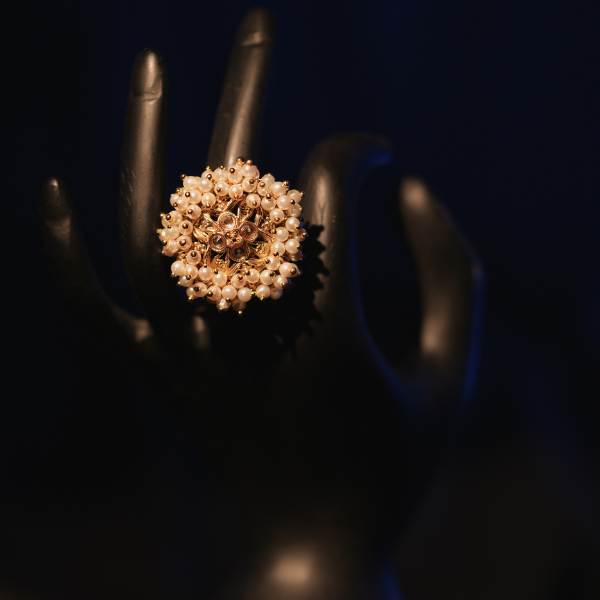 This Gold Plated Pearl Studded Ring showcases a beautifully crafted floral-inspired design, featuring luminous pearl beads arranged around a rich gold-plated base. The intricate detailing reflects traditional elegance while remaining lightweight and comfortable for daily or occasional use. Pearls symbolize purity and grace, making this ring a meaningful addition to any jewelry collection. Whether paired with sarees, lehengas, or contemporary attire, it delivers a sophisticated look that never goes out of style. A perfect choice for gifting or self-indulgence.