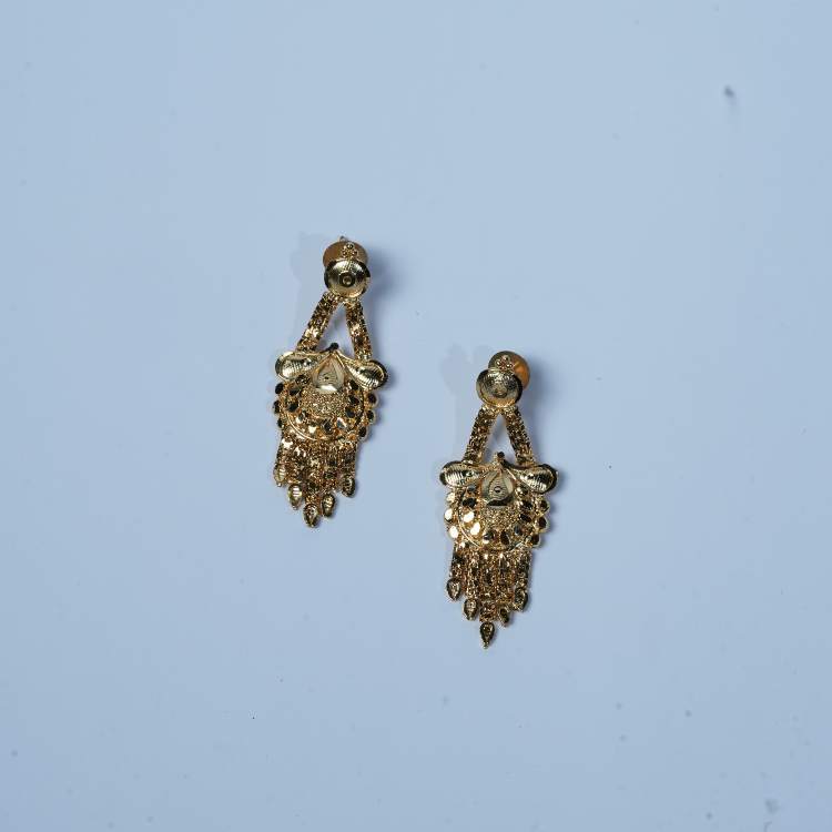 Make a royal style statement with this stunning gold rani haar necklace set, designed to reflect timeless Indian heritage and bridal elegance. The long, beautifully detailed chain features intricate gold-toned patterns that lead to an elaborate pendant with delicate craftsmanship and hanging accents. The matching earrings perfectly complement the necklace, completing a graceful and majestic look.