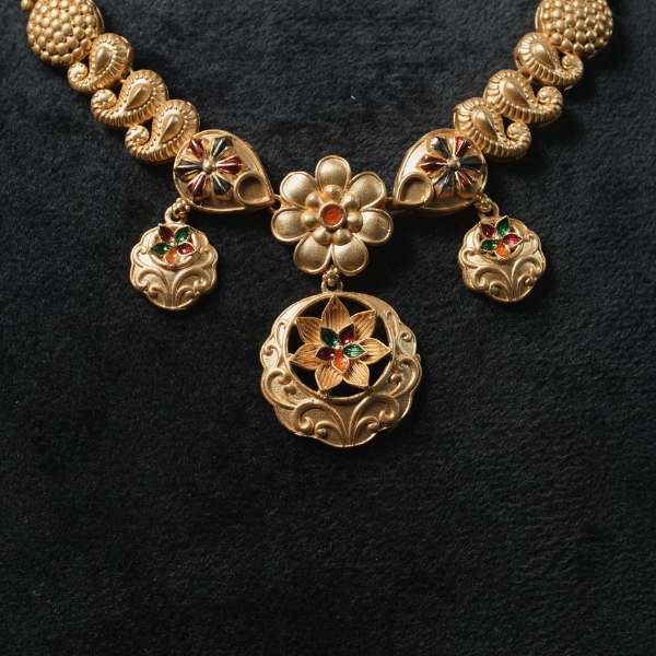 Ideal for festivals, weddings, poojas, cultural events, and traditional gatherings, this golden flower necklace set jorowar jhumko pairs beautifully with sarees, silk outfits, lehengas, and ethnic wear. A perfect choice for women who love classic designs with heritage value.