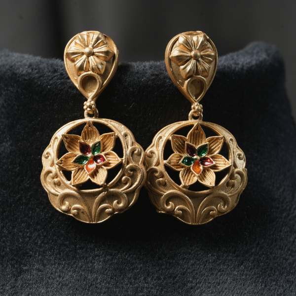 The premium gold-plated finish gives this set a rich, antique appeal while ensuring lightweight comfort for long hours of wear. The matching jorowar jhumko-style earrings echo the floral design, creating a perfectly balanced and elegant look.