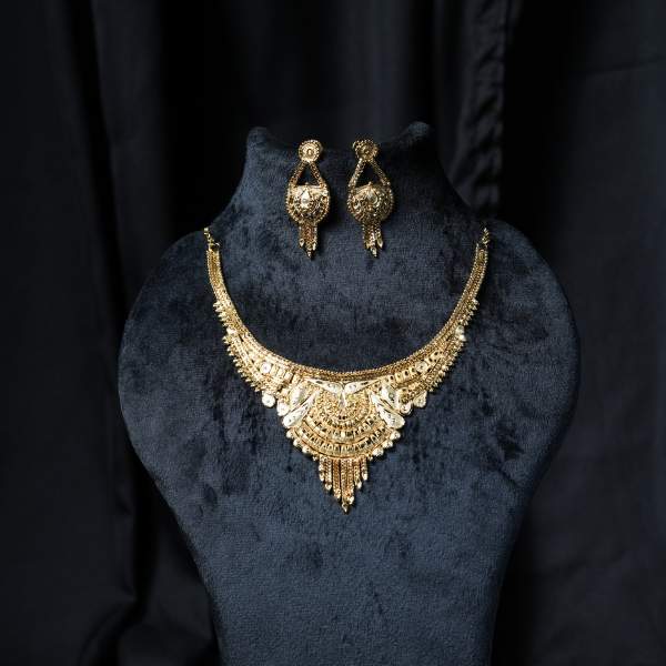 This Heritage Gold-Plated Necklace Set is a perfect blend of traditional design and contemporary wearability. Crafted on a durable brass base with high-quality gold plating, the necklace features intricate temple-inspired motifs that reflect India’s rich cultural legacy. The bold yet balanced structure sits comfortably on the neckline, making it ideal for weddings, festive celebrations, and special occasions. Paired with matching earrings, this set delivers a graceful, luxurious appearance without the weight of solid gold. Suitable for both Indian and international ethnic styling, it offers long-lasting shine and timeless appeal.