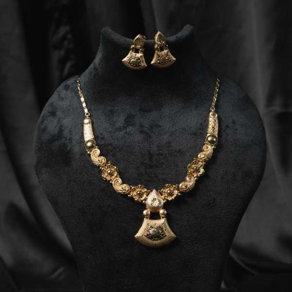 A timeless yellow gold jewelry set featuring an intricately designed necklace with a classic pendant and matching earrings. Perfect for weddings, festive occasions, and elegant traditional wear.