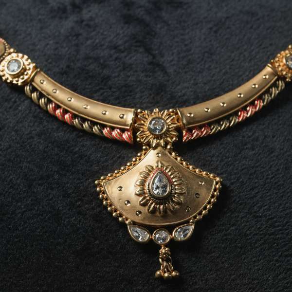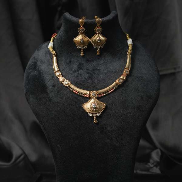 Paired with matching earrings, the set offers a complete and harmonious traditional look. The antique gold plating delivers a deep, heritage-inspired finish while remaining lightweight and comfortable for long wear.