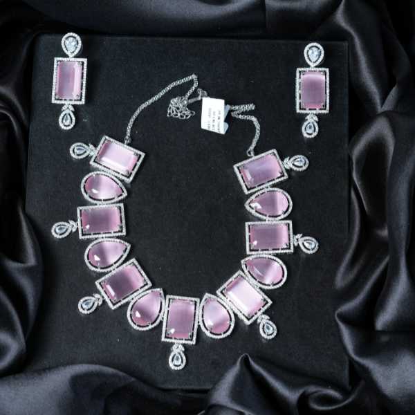 Make a refined style statement with this elegant rectangle stone necklace set, designed with carefully arranged geometric stones in a soft pink hue. Finished in a premium silver-tone metal, the necklace delivers a balanced blend of modern design and timeless charm. The matching earrings enhance the coordinated look, making it ideal for cocktail parties, festive occasions, weddings, and formal evenings. Lightweight, skin-friendly, and versatile, this rectangle stone necklace pairs beautifully with ethnic outfits as well as contemporary dresses. A perfect choice for women who love bold yet graceful jewelry with international appeal.