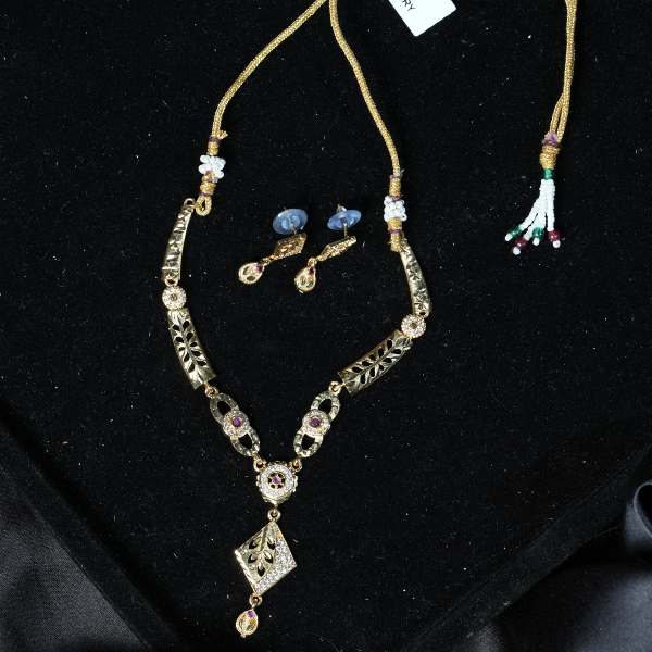 Add timeless sophistication to your jewellery collection with this beautifully crafted bezel setting necklace pendant set. Designed with precision, the pendant showcases a securely mounted bezel setting that highlights its central design while offering durability and a smooth, polished finish. The necklace features intricately detailed gold-finish elements along the chain, creating a graceful and balanced look. Matching earrings complement the pendant, completing the set with understated charm.