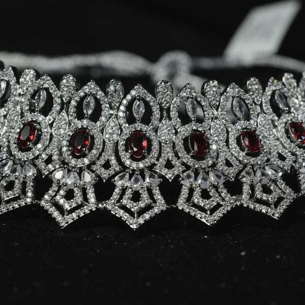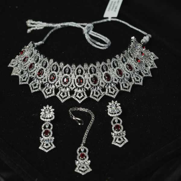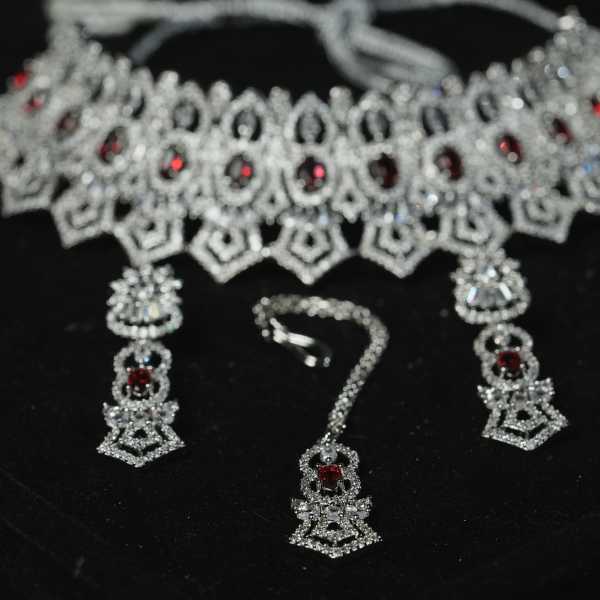 This luxurious silver bridal choker set is designed to add elegance and grace to your wedding ensemble. The choker features detailed geometric and floral patterns adorned with shimmering stones and subtle red accents, creating a royal and timeless look. The set includes matching earrings and a maang tikka, perfectly coordinated to enhance your bridal appearance.