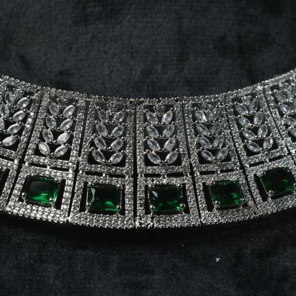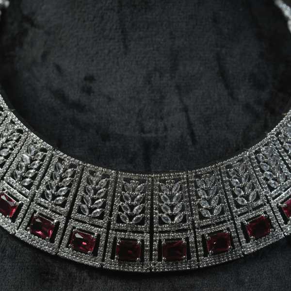 Make a bold yet graceful statement with this beautifully crafted silver choker necklace set, designed for women who appreciate timeless elegance. The necklace showcases a detailed silver-tone finish adorned with square-cut ruby red stones, creating a perfect balance of tradition and sophistication.
