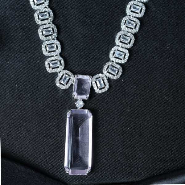 Make a refined style statement with this Silver Finish AD Necklace set, crafted with a high-polish silver finish and premium American Diamond stones. The sleek geometric pattern paired with elongated white stone drops offers a contemporary yet timeless appeal. Designed to complement both ethnic and western outfits, this lightweight necklace set ensures comfort for long wear. Ideal for weddings, festive occasions, parties, and formal events, it adds effortless elegance to your jewellery collection. A versatile accessory suitable for global fashion preferences and all age groups.