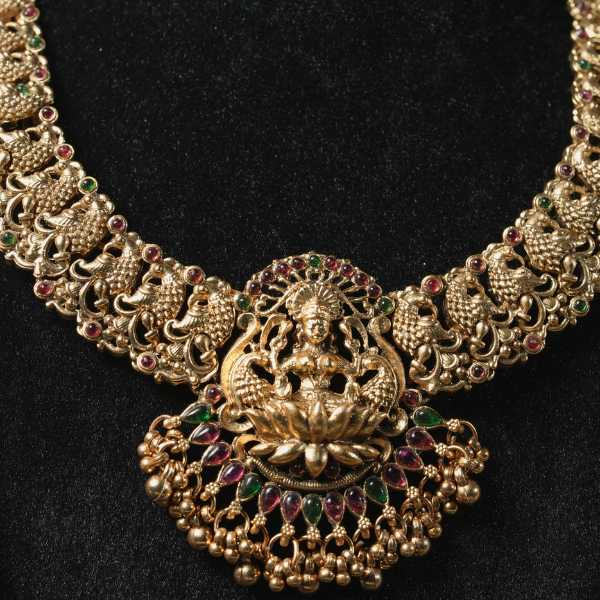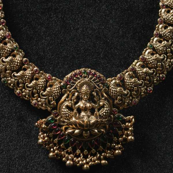 Celebrate heritage with this temple gold necklace, inspired by South Indian craftsmanship and divine Lakshmi motifs. Designed for brides and festive occasions, its antique gold tone adds depth, richness, and timeless charm.