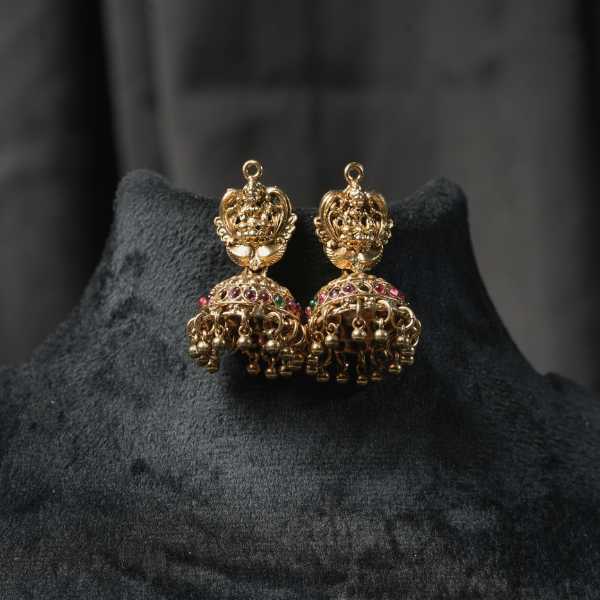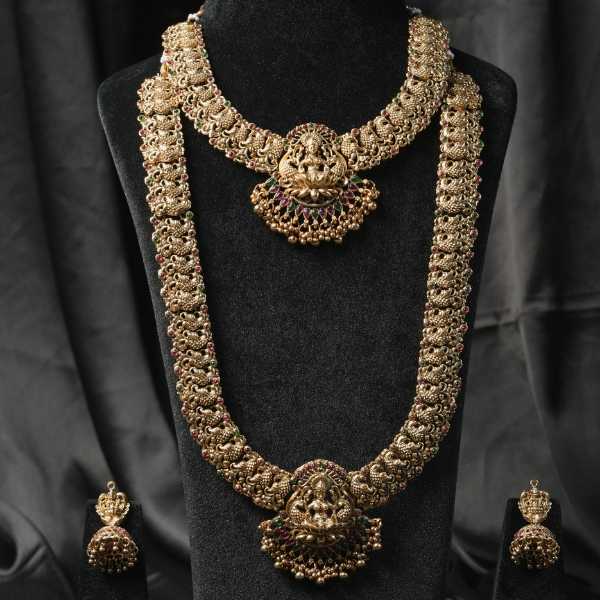 This temple gold necklace showcases intricate hand-finished detailing rooted in classical South Indian jewellery traditions. Featuring auspicious Lakshmi motifs and textured gold plating, the set includes a statement long haram, a complementary short necklace, and matching earrings. The antique finish enhances its heirloom appeal while remaining lightweight and comfortable for extended wear. Ideal for weddings, temple visits, festivals, and cultural celebrations, this necklace pairs beautifully with silk sarees, Kanjeevarams, and bridal ensembles. A perfect choice for women who value tradition, elegance, and lasting style in one powerful ornament.