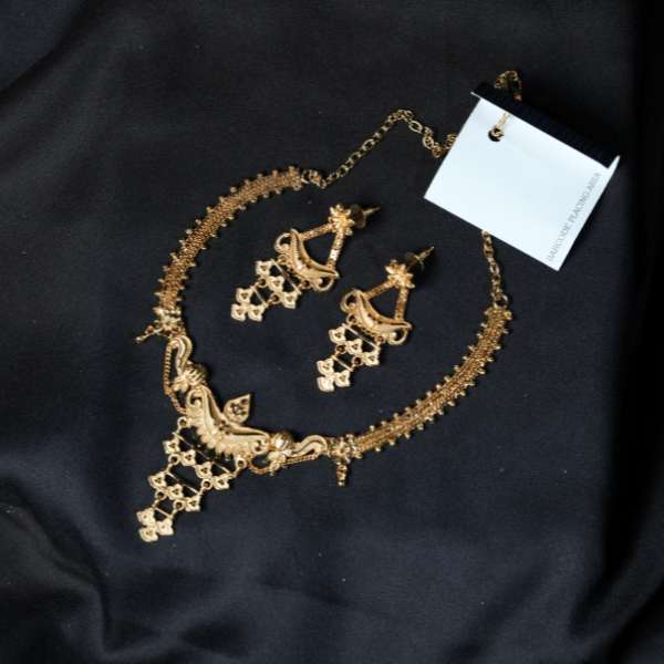 This Heritage Necklace Set reflects the richness of Indian tradition through intricate craftsmanship and classic antique gold finishing. Designed with heritage motifs and layered detailing, the necklace features a statement centre pendant paired with beautifully coordinated earrings.